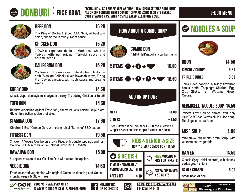 Welcome to J-DON Japanese Donburi Cafe, a delightful gem nestled in Vernon, BC. This cafe specializes in donburi and udon dishes, serving up authentic Japanese flavors in a cozy setting. Customers rave about the generous portions and exceptional taste, as seen in Caitlyn's recommendation of the combo don, which features both Hawaiian and beef options. Each bowl is artistically presented, while the atmosphere is light and inviting, perfect for a casual meal or a cozy gathering.